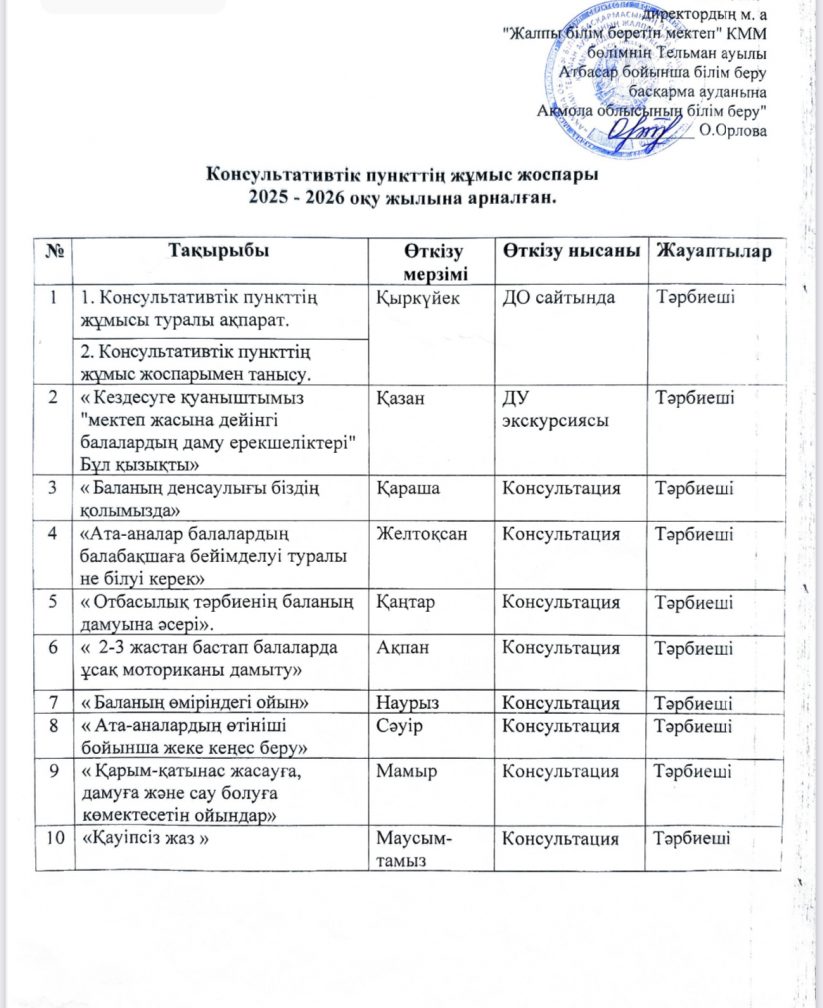Консультативтік пункттің жұмыс жоспары