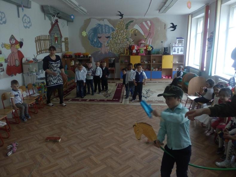детьми. Мероприятие началось с марша, под который ровным строем в группу вошли мальчики. Бурными аплодисментами их встречали нарядные девочки. Сюрпризным моментом для детей стало появление Бабы Яги, которая пришла с проблемой, как подготовить внука к армии. Чтобы стать настоящим солдатом дети научили Лешего правильно делать зарядку. Разделившись на команды «Крепыши» и «Смельчаки» мальчики участвовали в играх – эстафетах «Дорожка препятствий», «Прыжки из обруча в обруч», «Перетяни канат», «Самый меткий», «Морские котики», «Самолеты», «Скачки за флажком на лошадках», где показали свою ловкость, быстроту и смекалку. Чтобы помочь Лешему определиться в выборе направления в службе, дети познакомили его с разными видами войск, читая стихи. Не остались в стороне и девочки, подарив мальчикам задорное исполнение веселых частушек. Дети исполнили песни «Лучше папы друга нет!» и «Продедушка». Завершилось мероприятие вручением подарков, сделанных своими руками.