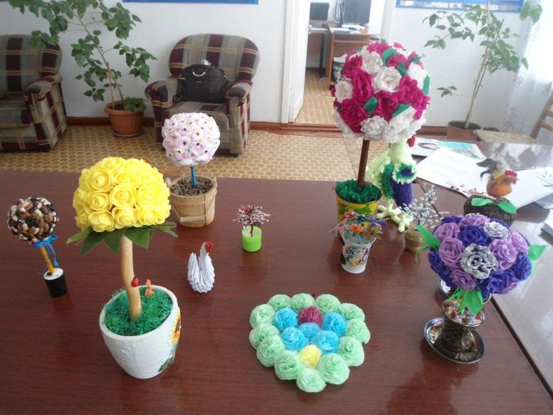 сизаля, соломы), из высушенных пряностей, зерен кофе и конфет, из искусственных цветов и плодов, из ткани, шнуров, лент и пряжи, из бумаги, салфеток, полиэтилена, пластика.