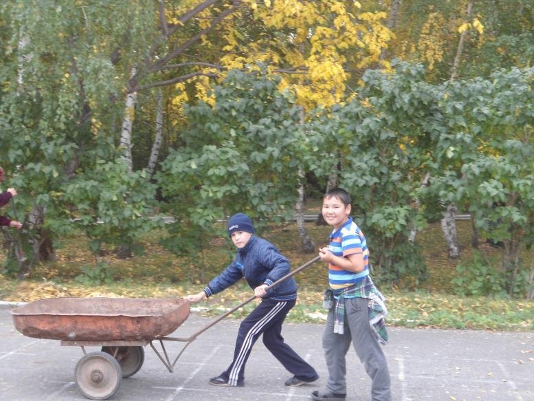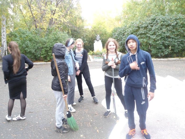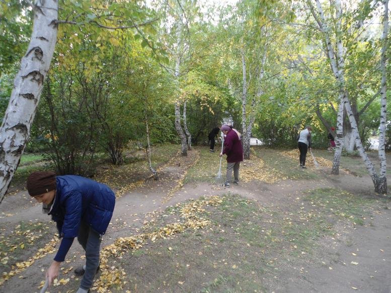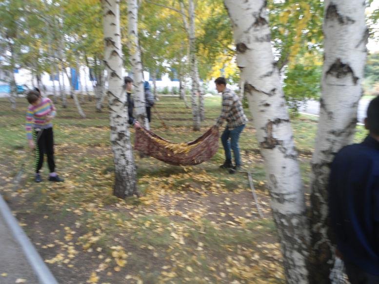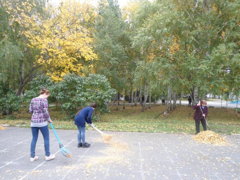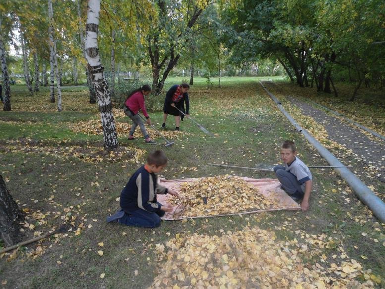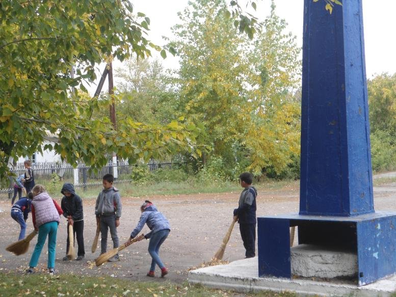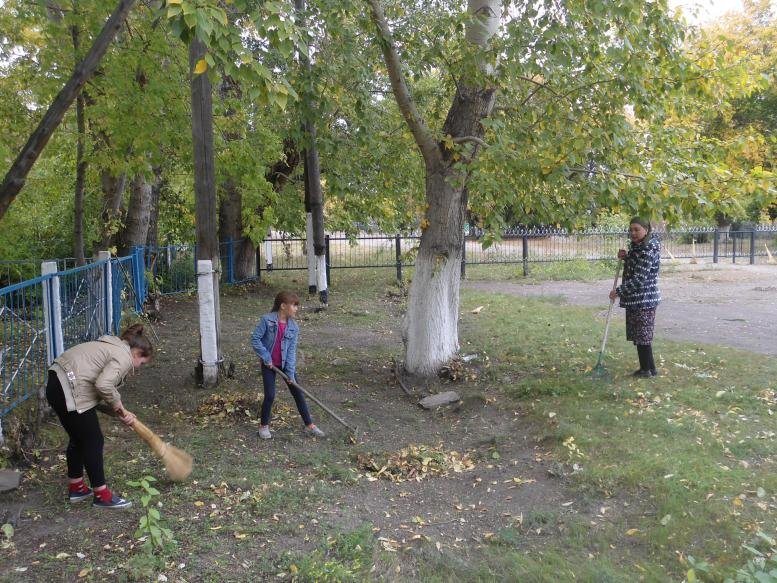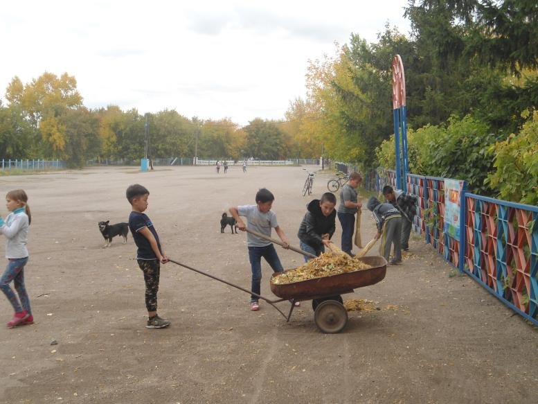 грести опавшую листву и убирать мусор. Все, и взрослые, и дети трудились с увлеченностью, большим душевным подъёмом, так как понимали важность подобного мероприятия не только для школы, но и для всего любимого поселка.