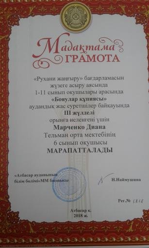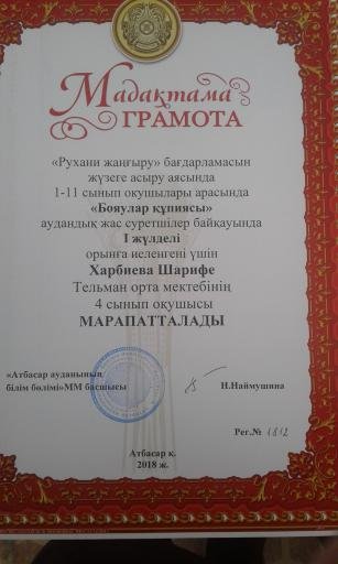 В начале февраля в школе и в районе прошел конкурс юных художников «Бояулар құпиясы». Наши художницы Варкентин А (8 кл.), Марченко Д.(6 кл.), Варкентин Э. (4кл.), Харбиева Ш.(4кл.) заняли призовые места в школе и приняли участие в районном конкурсе. Результат два призовых места: 1место уХарбиевой Ш. и 3 место у Марченко Д. и участие в областном конкурсе.