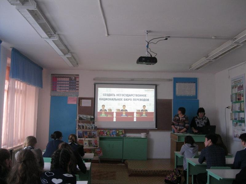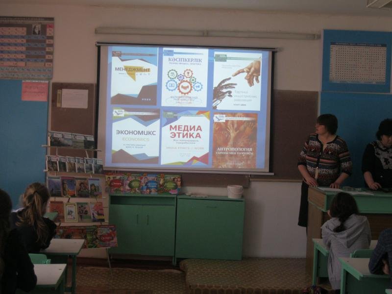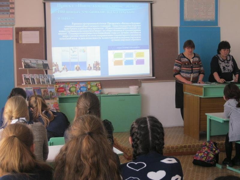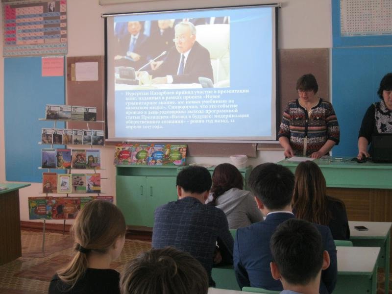 гуманитарное знание. 100 новых учебников на казахском языке» по общественным и гуманитарным наукам. 12 апреля 2018 года исполняется год со дня опубликования программной статьи Президента Республики Казахстан Н.А. Назарбаева, в рамках данного события с участием Главы государства состоялась презентация первых учебников, изданных и переведенных в рамках проекта. Ребятам был показан видеоролик о выставке 18 учебников переведенных с языка оригинала – английского, русского, французского на казахский язык. Подбор книг для перевода шел по таким направлениям, как история, политология, социология, философия, психология, культурология, религиоведение. Новые издания, теперь доступные на государственном языке. По мнению Главы государства, презентация первых книг в рамках проекта дала старт новому этапу программы модернизации общественного сознания. В следующем видеоролике "Новый уровень образования" Президент Республики Казахстан Н.А. Назарбаев отметил особую роль проекта «100 новых учебников на казахском языке» в деле просвещения молодого поколения. Проект « Новое гуманитарное знание. 100 новых учебников на казахском языке» дает четкое направление на то, чтобы дать новое качественное образование учащимся и всему подрастающему поколению, используя современные технологии и опыт развитых стран. Учащиеся ознакомились с выставкой книг советских и зарубежной классикой уже переведенных на государственный язык.