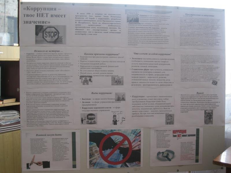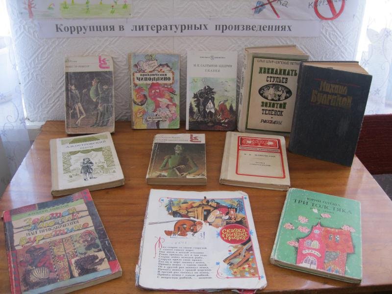 В школьной библиотеке была оформлена информационная – книжная выставка « Нет коррупции» в целях формирования антикоррупционных взглядов у обучающихся. Информационный стенд « Коррупция – твое НЕТ имеет значение» знакомит с информацией по таким разделам как: «Немного из истории…», «Каковы причины коррупции?», «Виды коррупции», «Что влечет за собой коррупция», «Преступление и наказание». Основная цель информационного стенда –привлечь внимание пользователей к проблеме коррупции и рассказать о ответственности за совершение коррупционных действий. На книжной выставке «Коррупция в литературных произведениях» представлены читателям книги русских и зарубежных писателей: «Ревизор» Н.В.Гоголя , «Золотой ключик, или приключения Буратино» А.Н.Толстого, «Три толстяка» Ю.Олеши, «Сказка о рыбаке и рыбке» А.С.Пушкина, «Доходное место» А.Н. Островского, «История одного города» М.Е.Салтыкова- Щедрина, «Чиполлино» Д.Родари, «Мастер и Маргарита» М.Булгаков – главные герои которых в той или иной мере совершают коррупционные действия. На стенде